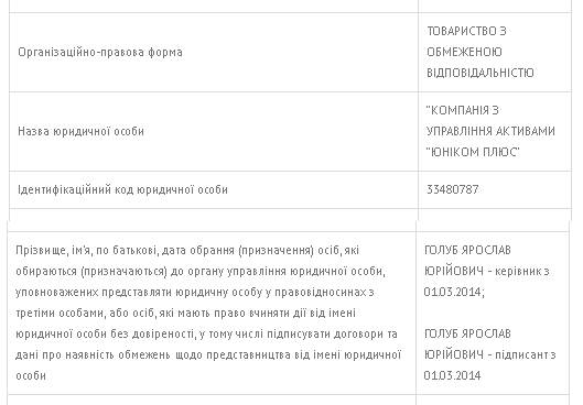 Одновременно тот же Ярослав Голуб руководит еще одной фирмой - компанией по управлению активами "Юником плюс". Она, в свою очередь, вместе с Андреем Перееденко является учредителями ООО "Бренд инвест":