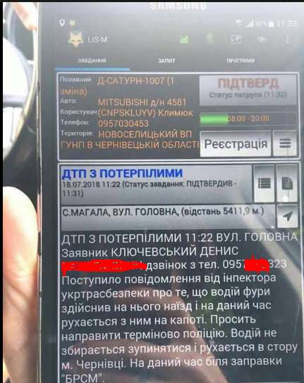 "Поступило сообщение от инспектора "Укртрансбезопасности" о том, что водитель фуры совершил на него наезд и движется с ним на капоте. Просит срочно направить наряд полиции. Водитель останавливаться не собирается и двигается в сторону Черновцов", ― зафиксировали правоохранители.