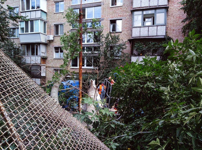Дерево росло на спортивной площадке романо-германской гимназии №123. При падении оно завалило металлическое ограждение, проломило бетонный забор и придавило автомобиль, который стоял рядом.