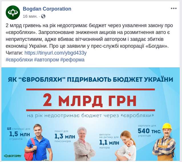 Корпорация «Богдан» нанесла новый удар по нерастаможенным автомобилям в Украине. На официальной страничке АТ «АК «БОГДАН МОТОРС» в Facebook появился баннер, который детально расписывает сколько денег не доходит в бюджет из-за блях, и какие категории населения от этого страдают.