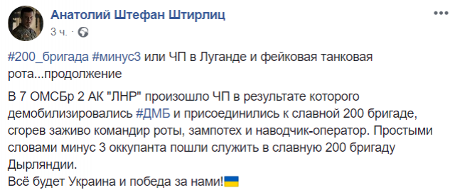 Офицер ВСУ Анатолий Штефан Штирлиц на своей странице в соцсети сообщил: «В 7-й ОМСБр 2-го АК „ЛНР“ произошло ЧП, в результате которого демобилизировались и присоединились к славной 200-й бригаде, сгорев заживо, командир роты, зампотех и наводчик-оператор. Простыми словами, минус 3 оккупанта пошли служить в славную 200-ю бригаду дырляндии. Все будет Украина, и победа за нами!».