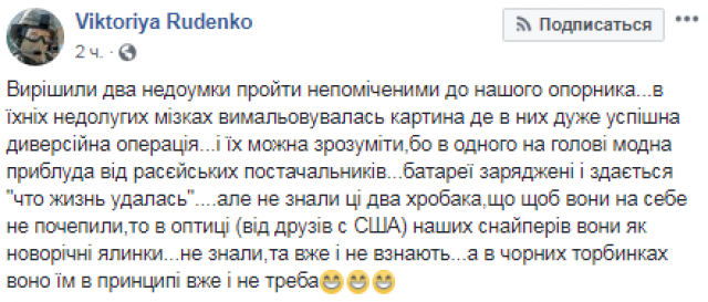Военнослужащая ВСУ Виктория Руденко на своей странице в соцсети сообщила, что боевики собирались устроить диверсионную атаку, но их своевременно заметили бойцы ВСУ. Руденко пишет: «Решили два недоумка пройти незамеченными к нашему опорнику. В их недалеких мозгах вырисовывалась картина, где у них успешная диверсионная операция… Но не знали эти два червя, что чтобы они на себя не повесили, то в оптике (от друзей из США) наших снайперов они как новогодние елки. Не знали, и уже и не узнают. А в черных мешках оно им в принципе уже и не надо».