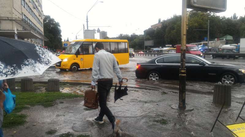 На улице Ванды Василевской из-за дождя образовалась пробка. А некоторым автомобилям вода доставала практически до капота. Под водой также оказались подземные переходы на Шулявке и возле КПИ. Однако, если в переходе на КПИ вода не поднималась выше уровня колен большинства пешеходов, то переход на Шулявке затопило до потолка. А на Дорогожичах дождь затопил транспортную развязку.
