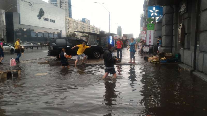 «Чета не уверен насчет побегать», — написал киевлянин Дмитрия Клищук. На Татарке вода поднялась настолько высоко, что затопила прилавки уличных торговцев, а некоторые молодые люди переносили девушек по улице на руках. На Вышгородской улице пешеходы вынуждены были ходить по колено в воде.