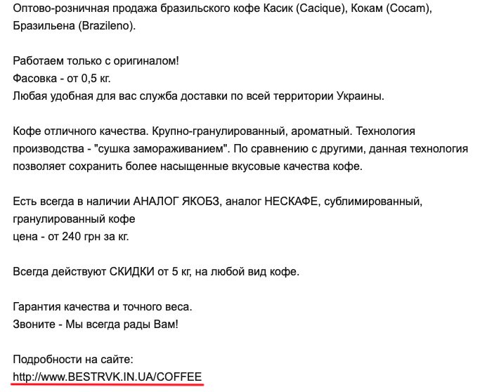 Отметим, что на этом же сайте ранее продавали кофе. На данный момент страница bestrvk.in.ua/coffee/ удалена, но сохранилась ее копия в «Архиве Интернета». На развес продавали гранулированный и сублимированный кофе.