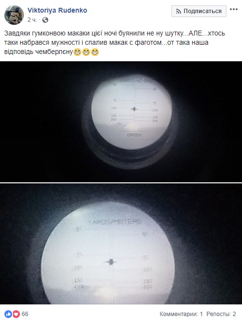 "Благодаря гумконвою макаки ночью буянили не ну шутку ... Но ... кто-то все же набрался мужества и сжег макак с фаготом ... вот такой наш ответ чемберлену", - пишет Руденко.