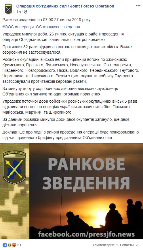 Тем временем в пресс-штабе Операции объединенных сил сообщили, что за сутки 26 июля на Донбассе были зафиксированы 32 обстрела со стороны боевиков. По данным разведки, двое оккупантов погибли, еще двое – были ранены.