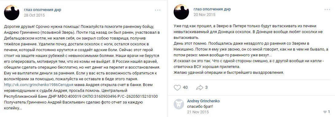 В декабре 2015 года координатором организации «Феникс Донбасса», занимающейся сбором денег на лечение боевиков «ДНР-ЛНР», был выложен видеоролик, в котором Гринченко благодарит за помощь в сборе денег. После операции он не бросил воевать, а через некоторое время начал публиковать интересные снимки.