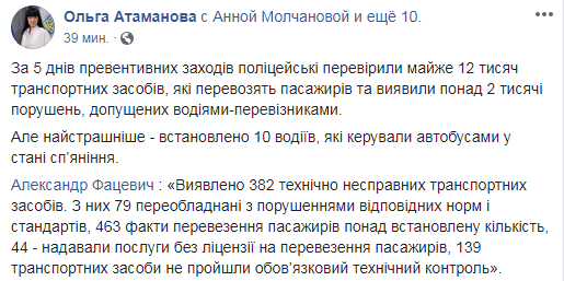 "Но самое страшное – выявлено 10 водителей, которые управляли автобусами в состоянии опьянения", - написала она.