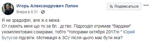 Лапін опублікував фото, на яких видно, що сокири були виготовлені в Росії в жовтні 2017 року. "Мотивація в ЗСУ після цього повинна бути якась?" - задається питанням нардеп.