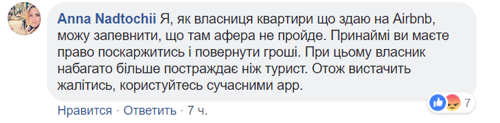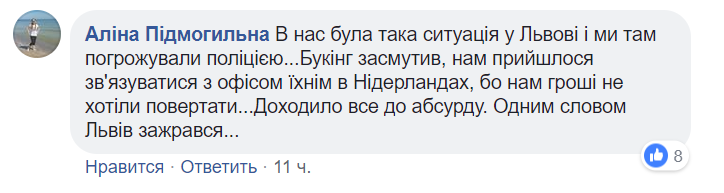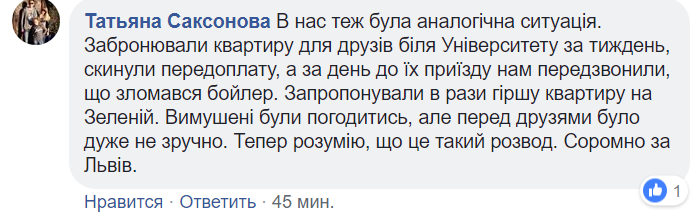 "Это было весной, мы ехали из Венгрии и так же хотели остановиться во Львове! И так же нам в последнюю минуту позвонили и сказали, что наше бронирование отменено но они могут нам предложить другое помещение. (Предоплату они с нас списали за сутки до того). Мы отказались и поехали через Тернополь, где прекрасно провели время", - сообщила Москаленко.