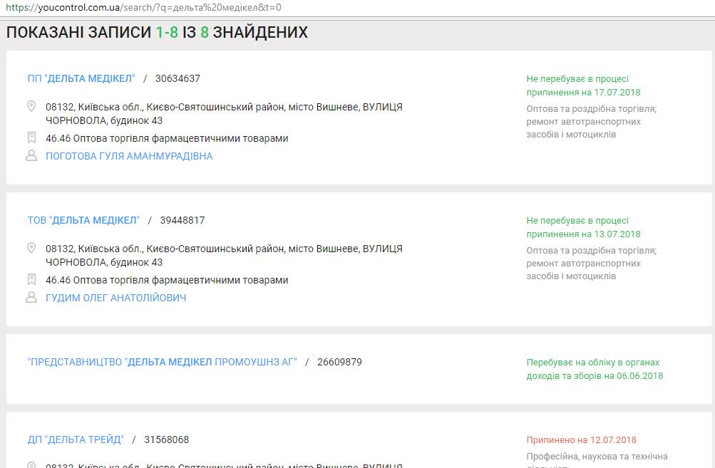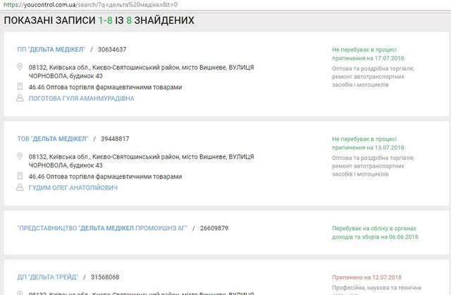 Нам удалось установить, что Светлана Таболина работала в ЧП «Дельта Мэдикэл» («Дельта Медікел» – в украинской версии). Сам по себе ЧП как ЧП, но YouControl связывает его с рядом других влиятельных структур. Например, ДП «Дельта Трейд», ООО «Агротранс-Холдинг», ООО «Максима Хелс Рисёч», ДП «Аптека Дельта» и др.