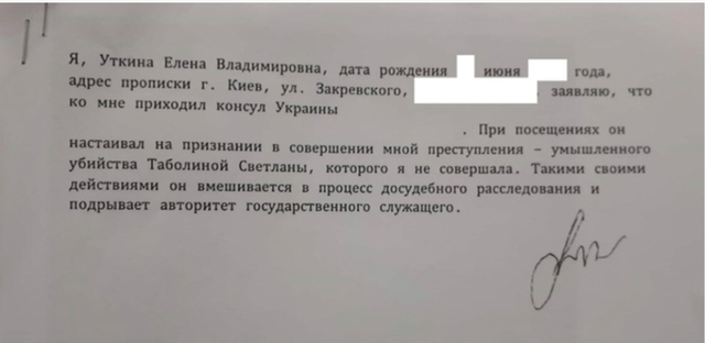То, что следствие пошло (точнее, его повели за руку) по заведомо ложному следу, подтверждают и последние новости из Испании. Как на днях писали СМИ, Елена Уткина, содержащаяся в Пенитенциарном центре Мадрид VII (аналог украинского СИЗО), подверглась беспрецедентному давлению. Взять на себя вину, от Елены требовал лично украинский консул Владимир Грабовенко. Соответствующее заявление Елена написала сразу же, и оно содержится в материалах дела.