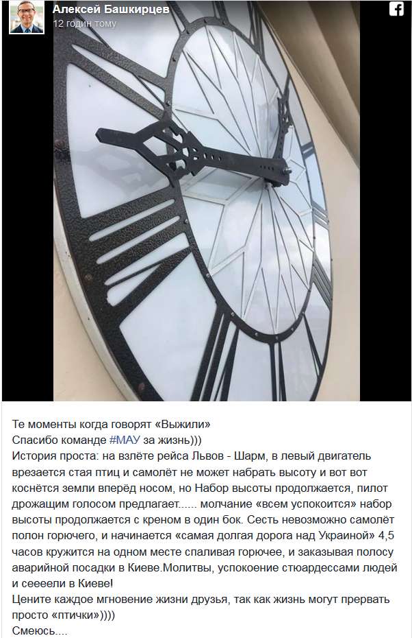 "Те моменты когда говорят "Выжили". Спасибо команде МАУ за жизнь. История проста: на взлете рейса Львов - Шарм, в левый двигатель врезается стая птиц и самолет не может набрать высоту и вот-вот коснется земли вперед носом, но набор высоты продолжается, пилот дрожащим голосом предлагает... "всем успокоится", набор высоты продолжается с креном в один бок. Сесть невозможно - самолет полон горючего, и начинается "самая долгая дорога над Украиной". 4,5 часов кружится на одном месте спаливая горючее, и заказывая полосу аварийной посадки в Киеве. Молитвы, успокоение стюардессами людей и сеееели в Киеве! Цените каждое мгновение жизни друзья, так как жизнь могут прервать просто "птички")))) Смеюсь...", - написал Алексей Башкирцев.