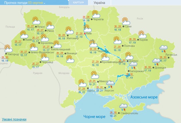 Отмечается, что 1 августа в западной части, 2 августа в восточных областях кратковременный дождь, гроза, на остальной территории без осадков. Ветер восточный, северо-восточный, 5-10 м/с, на юге и востоке страны местами порывы 15-20 м/с. Температура ночью 17-22°, в западных и северных областях 14-19°; днем 24-29°, в южной, восточной части и на Закарпатье до 33°.