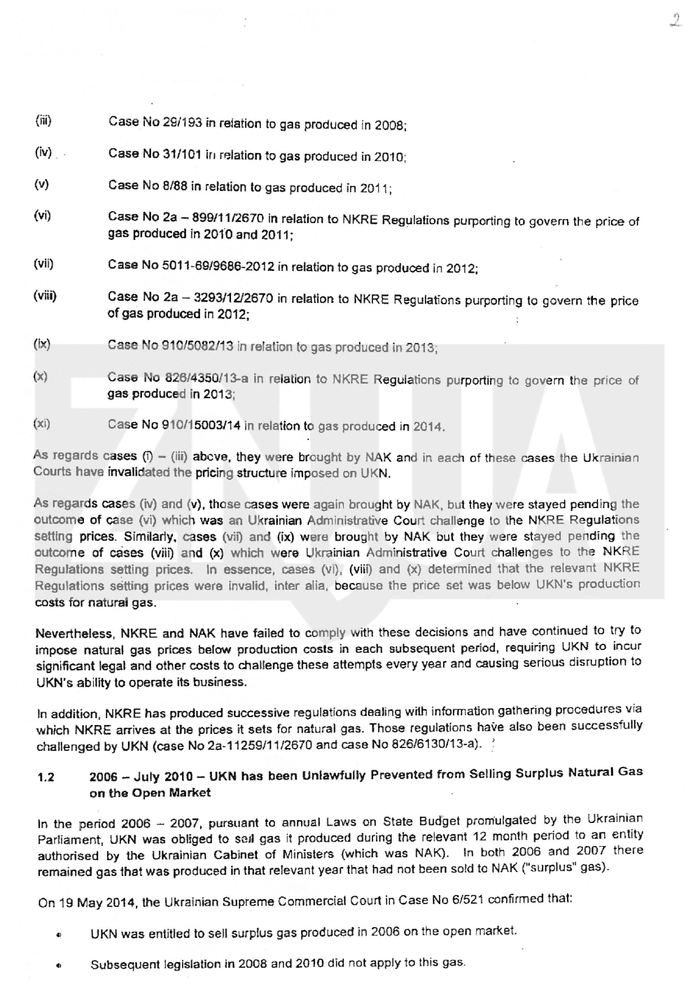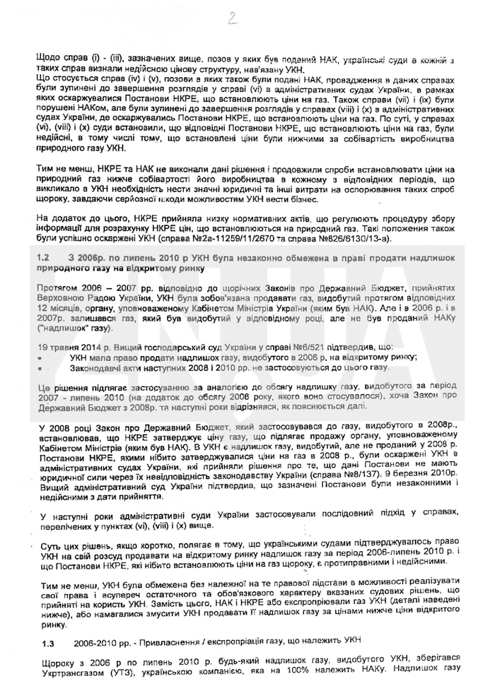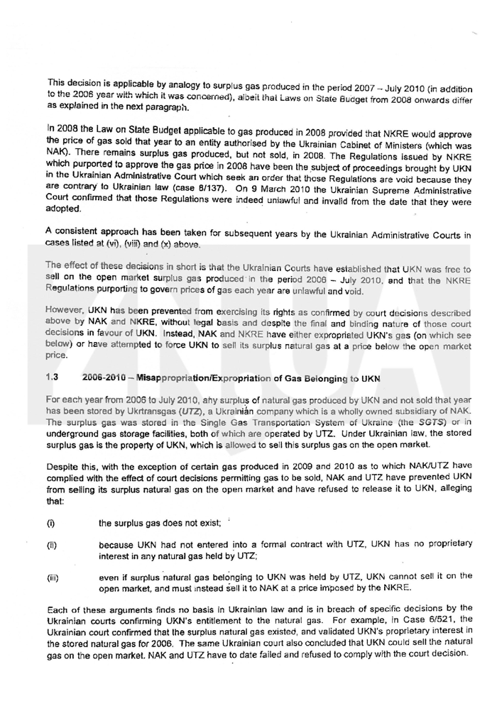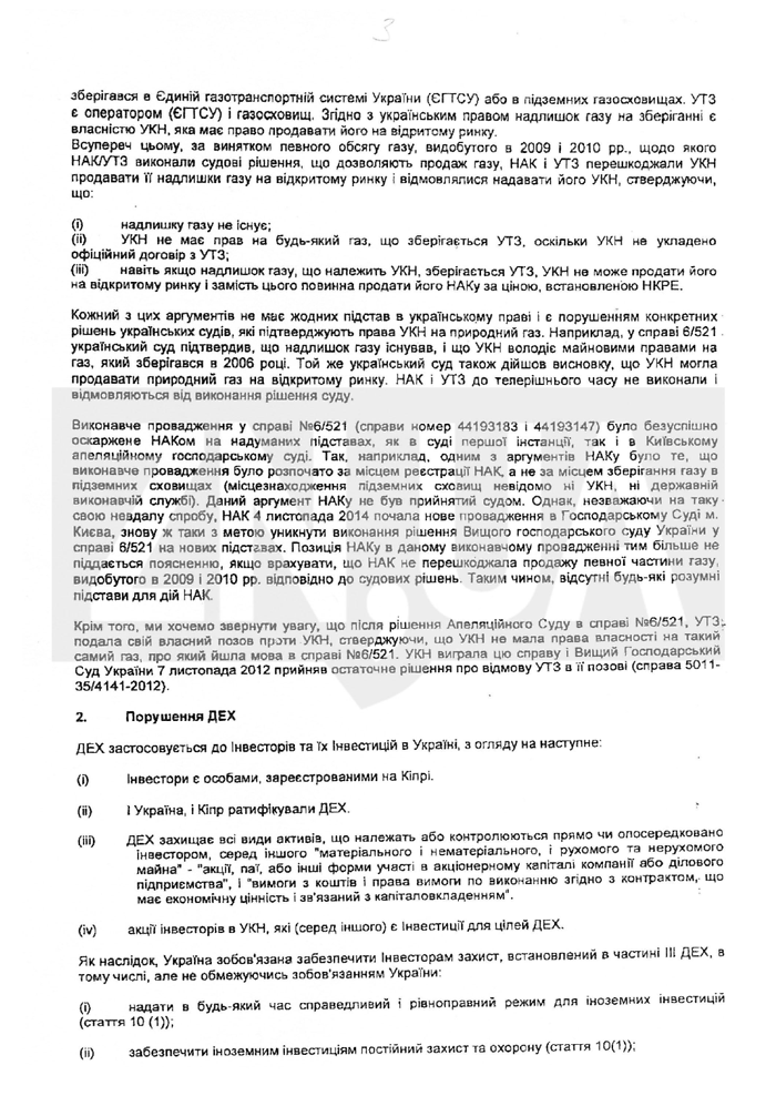 Таким образом, своими действиями в отношении инвестиций, как описано выше, Украина нарушила каждое из упомянутых выше обязательств по ДЭХ (Договору об Энергетической Хартии. – примечание ZN.UA) и причинила инвесторам и УКН существенные убытки, которые превышают 5 миллиардов долларов США. Инвесторы требуют компенсации этих убытков, а также гарантии того, что Украина впредь будет выполнять свои обязательства в соответствии с законодательством Украины и ДЭХ".