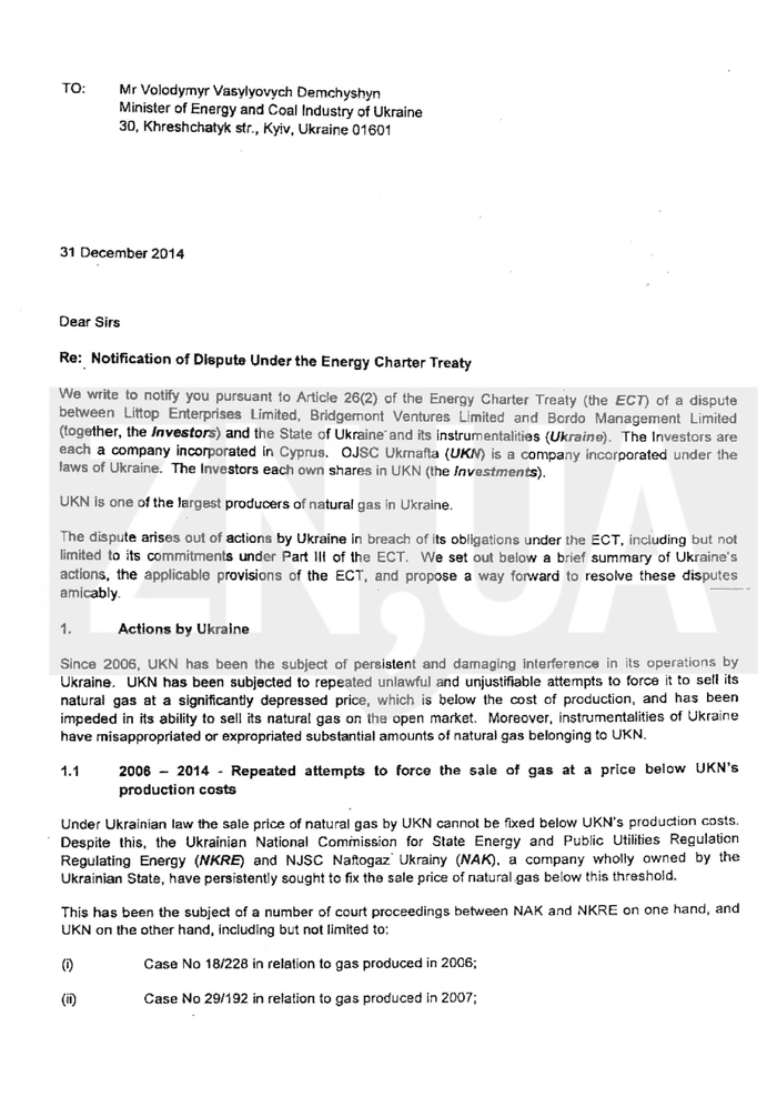 Именно эти три кипрские инвесторы "Укрнафты" 31 декабря 2014 г. направили министру энергетики и угольной промышленности Украины Владимиру Демчишину письменное уведомление (копией и переводом которого располагает редакция ZN.UA) о намерении решить, по их утверждению, многолетний спор между ними"инвесторами" и государством Украина и всеми ее государственными структурами".