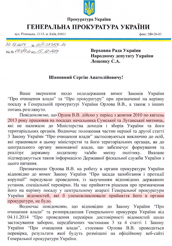 Згідно з законом про очищення влади, Орлов має бути люстрований, бо більше року в період з 25 лютого 2010 року по 22 лютого 2014 року обіймав посади з цього переліку (підпункт 7 пункту 1 статті 3 закону):