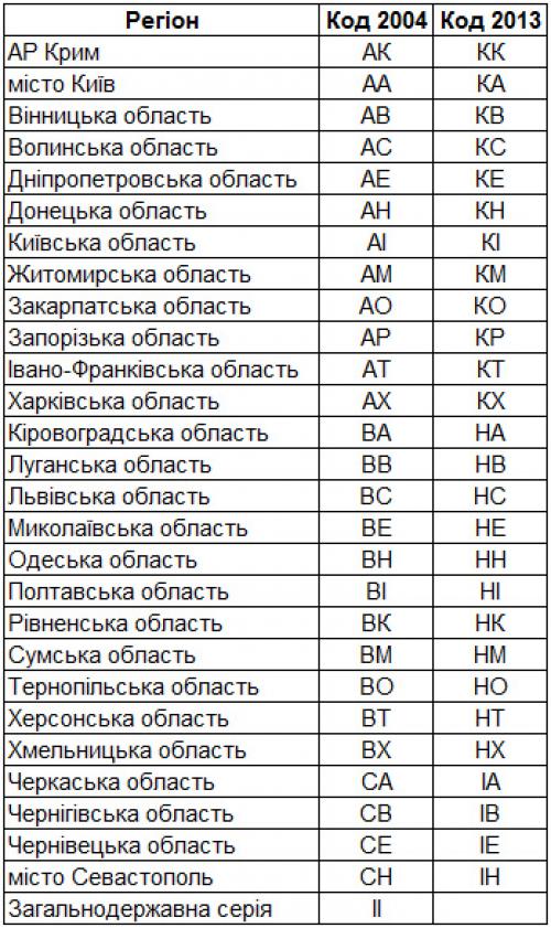 Издание отметает, что с 2004 года коды регионов были распределены исключительно с использованием букв, совпадающие в латинском и в украинском алфавитах, начиная с Киева: АА, АВ, АС и т.д., в интервалах АА - АХ, ВА - ВО, ВТ - ВХ, СА - СВ, СЕ - СН.