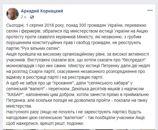 "Министру юстиции Петренко дали две недели на рассмотрение жалобы партии, отмены незаконного распоряжения об отказе в регистрации партии и на регистрацию партии. А чтобы не забыл об этой "просьбе", дали "крестьянскую взятку" в крестьянской "валюте" – перегноем. Несколько мешков с надписью "ВЗЯТКА", наполненных этим добром, хотели занести прямо в приемную Петренко, но поскольку полиция не позволила пройти – положили на крыльце министерства. В следующий раз (если не услышат и не зарегистрируют партию) будут накормлены этой крестьянской "валютой", – так пообещали участники акции. Чтобы нажрались, наконец, подонки", – написал нардеп.