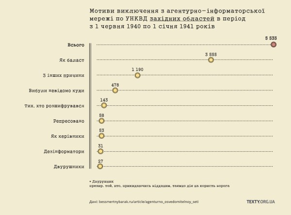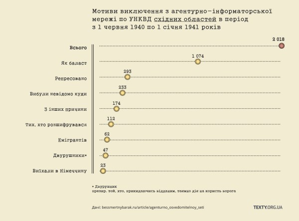 Але робота на спецслужби - нестабільне заняття. За 1940 рік 7.5 тисяч випали з агентурної мережі. Когось списали, як “баласт”. Вони не приносили цікавої інформації і нікого не викривали. Саме таких було найбільше. Ще частину репресували, викрили або ж ці люди просто зникли. Деякі агенти стали “двурушниками” - подвійними агентами.