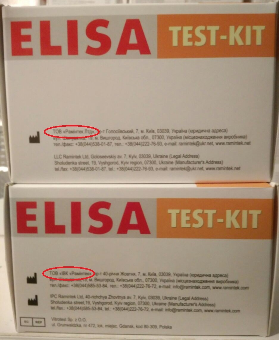 А на упаковках своих тест-систем «Раминтек ЛТД» продолжает указывать, что ее продукция «Vitro-Test» обладает сертификатами госпредприятия Минздрава — «Государственный медицинский центр сертификации», и даже использует его маркировку — UA.TR.067. Но казус состоит в том, что в марте 2018 года Нацагентство по вопросам аккредитации (НААУ) отменило аттестат про аккредитацию ГП ГМЦС МОЗ за множественные нарушения, а Минэкономразвития в апреле аннулировало решение о назначении этого предприятия органом по оценке соответствия продукции требованиям технических регламентов. С этого момента ни один производитель не имел права маркировать свою продукцию UA.TR.067. Однако, «Раминтек Лтд» сознательно идет на нарушение, и продолжает незаконно производить наборы для диагностики опасных инфекций, ставя на упаковке реквизиты неуполномоченного органа с аннулированной аттестацией. Проще говоря, это означает, что сертификатов соответствия у продукции «Vitro-Test» нет.