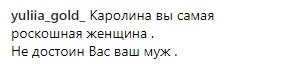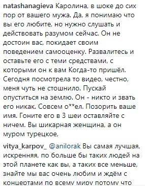«Каролина вы такая красотка, шикарная женщина, талантливая певица ,он не стоит и вашего мизинца…», «Каролиночка, мы любим вас и мы всегда с вами», «Каролина вы самая лучшая на свете», «Каролина, в шоке до сих пор от вашего мужа. Да, я понимаю что вы его любите, но нужно слушать и действовать разумом сейчас. Он не достоин вас, покидает своим поведением самооценку. Развалитесь и оставьте его с теми средствами, с которыми он к вам Когда-то пришёл. Сегодня посмотрела то видео, честно, меня чуть не стошнило. Пускай опуститься на землю. Он — никто и звать его никак. Совсем о**ел. Позорить ваше имя. Гоните его в 3 шеи оставляйте с ничем. Вы шикарная женщина», — поддерживают певицу фаны.