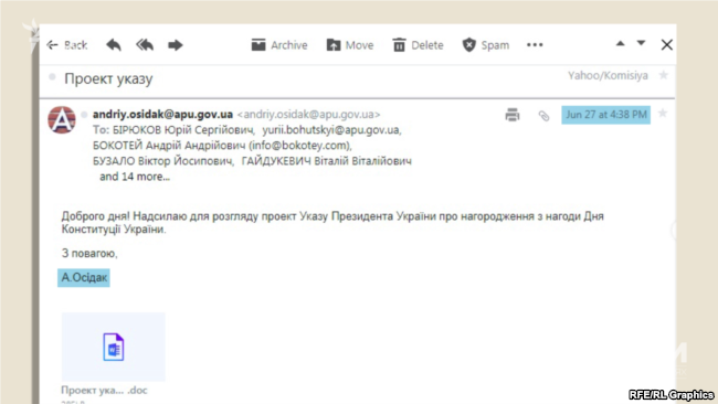 Голова департаменту державних нагород справді розіслав членам комісії проект указу президента з переліком осіб до нагородження на честь Дня Конституції того ж дня, 27 червня. Такі листи «Схемам» показали одразу декілька членів комісії. Не дивно, що у них навіть теоретично не могло бути часу, щоб перевірити усіх осіб із переліку.