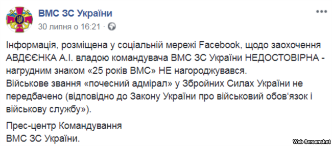 Звання почесного адмірала, яким хизується Авдєєнко, – також вигадане. У прес-службі Військово-морських сил України офіційно заявили: