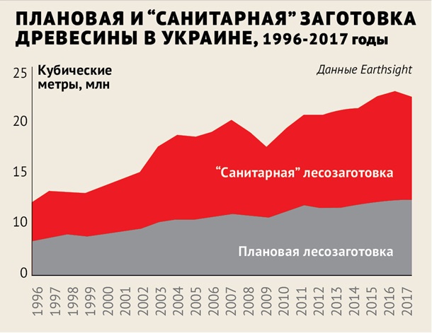 Что касается “черной” рубки леса, то, по данным Минэкономики, в 2017 году на нее пришлось всего 26 тыс. куб. м, или 0,12 % общего объема заготовленной древесины. Михаил Попков, старший научный сотрудник Института агроэкологии НААН, уточняет, что ситуация связана с законодательством: “Главное, что нужно понять, — криминальные и абсолютно невыгодные лесному хозяйству и народу вырубки могут быть законными. Они могут быть прописанными в законодательстве, позволяя формально назначать те или иные рубки, экспортировать деловой лес как топливную древесину”.