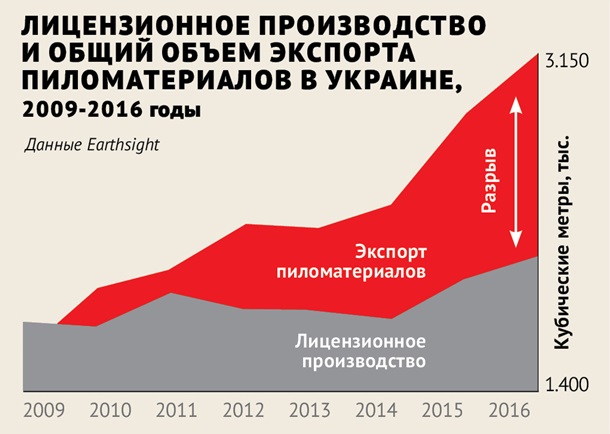 В качестве примера британские исследователи указывают поставки “санитарного” и приобретенного на полупрозрачных аукционах леса “теневыми” лесопилками, количество которых было оценено ими в 12 тыс. единиц. Впоследствии “схемный” лес экспортируется через таможню либо напрямую как лес-кругляк, либо как пиломатериалы или дрова. В результате только “белый” экспорт пиломатериалов из Украины превышает его официальное производство в среднем на 75 %. Экспорт дров и топливной древесины (статей — лидеров лесного экспорта после введения моратория на экспорт необработанной древесины), по данным таможенной статистики, в физическом выражении за 2015‑2017 годы выросли на 80 % и 12 % соответственно. А одновременно зафиксированный экспорт леса-кругляка, несмотря на действующий запрет, составил в 2017 году 10,7 тыс. тонн.