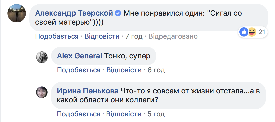"Стивен и Мария решили пофлиртовать на камеру. Публика уже стала забывать, решили сфоткаться для рейтинга", "Только сейчас обратил внимание, что Сигал одет в штору", "Сигал со своей матерью", "Я бы поостерегся с Сигалом рядом находиться - то корабль, то поезд, на котором он едет, террористы захватят. Тут, похоже, ресторан в опасности", "Хоть голову помыла", - написали в комментариях.Острые и складныеот 52 грнАромат женственностиПоменяйте чайник