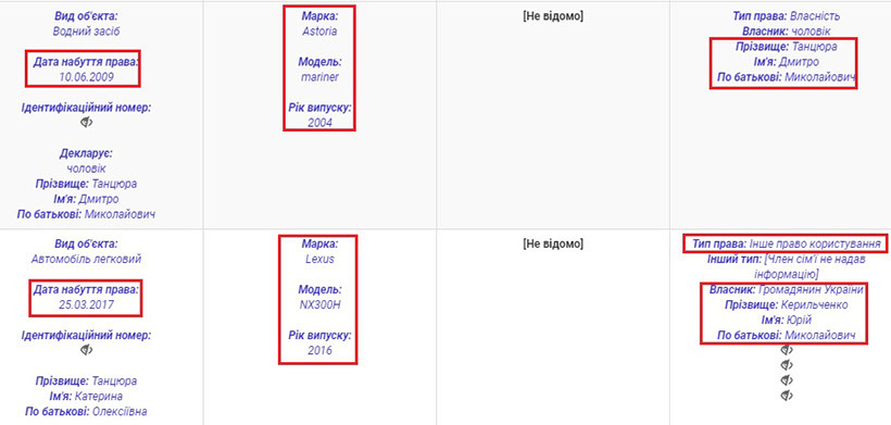 У свою декларацію суддя Катерина Танцюра занесла чотири транспортні засоби. У чоловіка Дмитра Танцюри є Volkswagen Touareg 2011 року випуску, Jeep Wrangler 2008 р. в. та водний засіб Astoria mariner 2009 р. в. Однак на праві користування у сім’ї також є Lexus NX300H 2016 року випуску, втім належить він іншій особі. Його власник – Юрій Миколайович Керильченко.Оскільки його ім’я вже не одноразово згадується у матеріалі, цілком ймовірно він є наближеним до суддівської родини. Сам помічник депутата Танцюри працює … поліцейським, як свідчить його майнова декларація. Торік він заробив всього 32 929 гривень, тоді як вартість Lexus NX300H близько мільйона. Такі обставини можуть кваліфікуватися правоохоронними органами як незаконне збагачення.