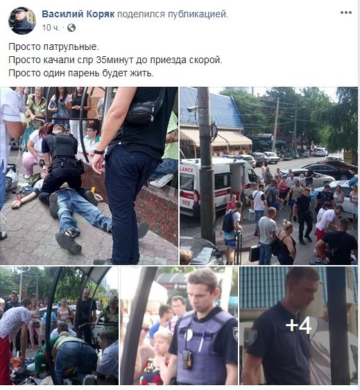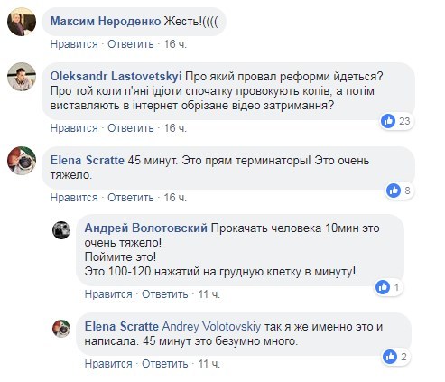 "На фоне провала реформы: есть полицейские, которым можно пожать руку. Экипаж ПП совместно с прохожими "качали" парня до приезда "скорой помощи", около 35 минут. После чего помогали медикам. В итоге совместными усилиями парень задышал", – написал пользователь Гена Литовченко.
