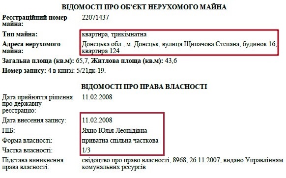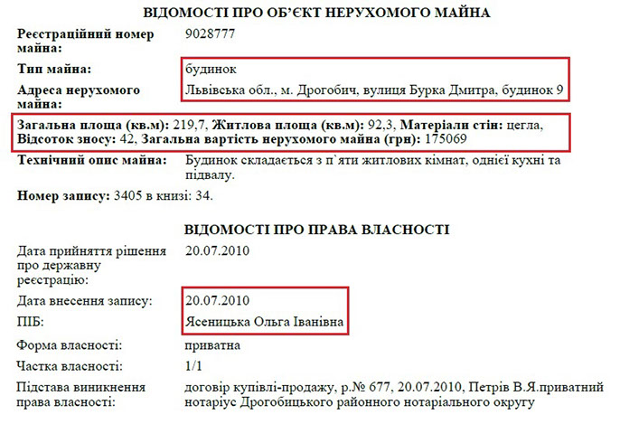 Окрім цього житла, Ольга Іванівна Ясеницька є власником квартири у Львові за адресою: вул. Некрасова, 53/55. Також пані Ольга володіє будинком площею 219 кв. м. у Дрогобичі та двома нежитловими приміщеннями.