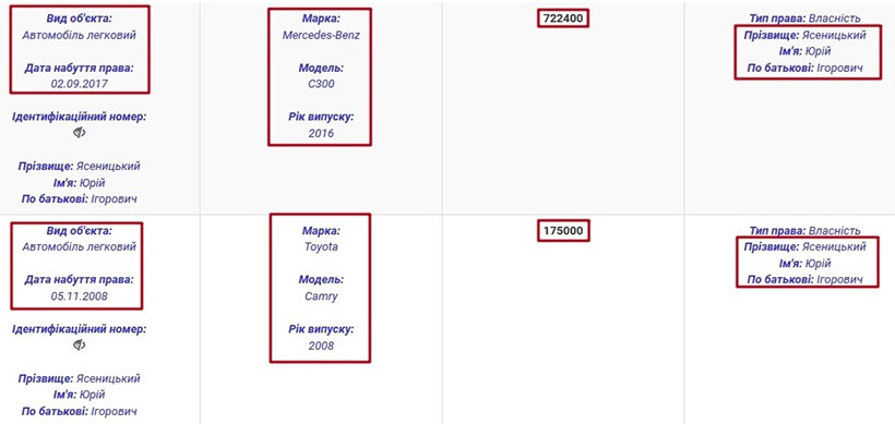 Якщо говорити про рухоме майно подружжя, то в декларації вказано, що Юрій Ігорович із 2017 року є власником Mercedes-Benz C300 2016. Задекларована вартість цього авто – 722 тис. грн. Окрім того, Юрій Ясеницький володіє Toyota Camry 2008 вартістю 175 тис. грн (станом на 2008 рік).