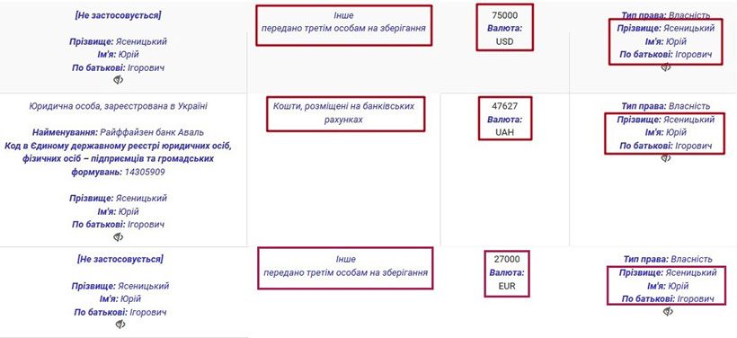 Окрім нерухомого та рухомого майна, у власності Юрія та Юлії Ясеницьких є досить багато збережень. Наприклад, Юрій Ігорович передав третім особам на зберігання 75 тис. дол., 27 тис. євро, а також задекларував 53 тис. грн. Аналогічним чином вчинила і Юлія Леонідівна та передала на зберігання 93 тис. дол. і 87 тис. євро. Окрім того, Юлія Леонідівна вказала, що у 2014 році отримала кредит у розмірі 47 тис. дол.