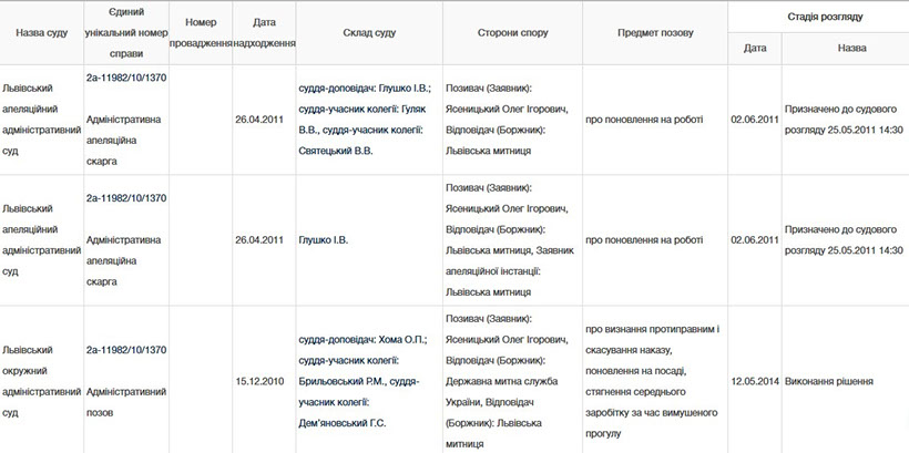 Що цікаво, у 2010–2011 роках Олега Ігоровича звільнили з посади старшого інспектора відділу митного оформлення № 3 митного поста «Мостиська» Львівської митниці. Причиною звільнення було те, що він пропустив 4 автомобілі з Польщі без митного оформлення.«Вищевказане свідчить про ознаки переміщення зазначених транспортних засобів із вантажем через митний кордон України з уникненням від оподаткування, незаконним звільненням від митного контролю та порушенням встановленого порядку ввезення (пересилання) в Україну, митного оформлення й оподаткування особистих речей, товарів і транспортних засобів що ввозяться (пересилаються) громадянами на митну територію України, передбаченого Законом України від 13 жовтня 2001 року № 2681-III». Однак суд погодився з позивачем, тобто Олегом Ясеницьким, і визнав звільнення протиправним, чим поновив його на посаді.