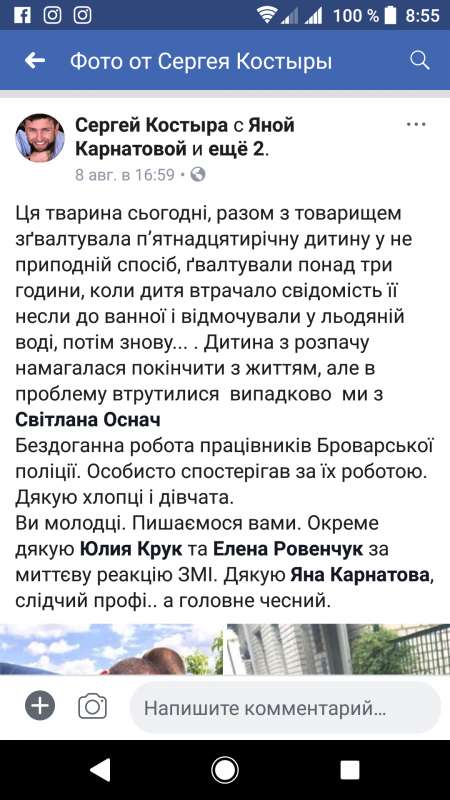 В соцмережі на сторінці відомого в Україні адвоката Сергія Костири також з’явилась інформація про зґвалтування неповнолітньої дівчини в Броварах. Яким чином він опинився під час затримання злочинця, поки що залишається невідомим.