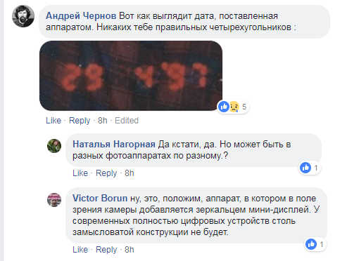 В комментариях к его посту пользователи отметили, что фото могут и не быть подделкой, поскольку из-за особенности изображений в формате JPEG могут возникать подобные эффекты с проставкой даты, а "приклеенная" голова на самом деле эффект от тени.