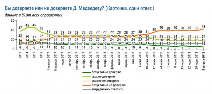 Рейтинг доверия Путину также снизился. Так, на вопрос «Вы доверяете или не доверяете В. Путину?» вариант ответа «безусловно доверяю» в августе выбрало только 24% опрошенных, тогда как в марте этого года таких было 43%.