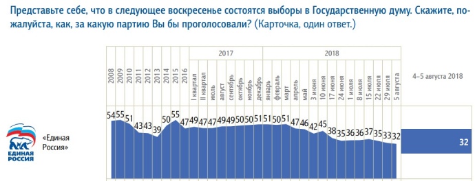 Рейтинг партии «Единая Россия» составляет 32%. В январе 2018 года он составлял 51%, а в 2015 году – 55%.