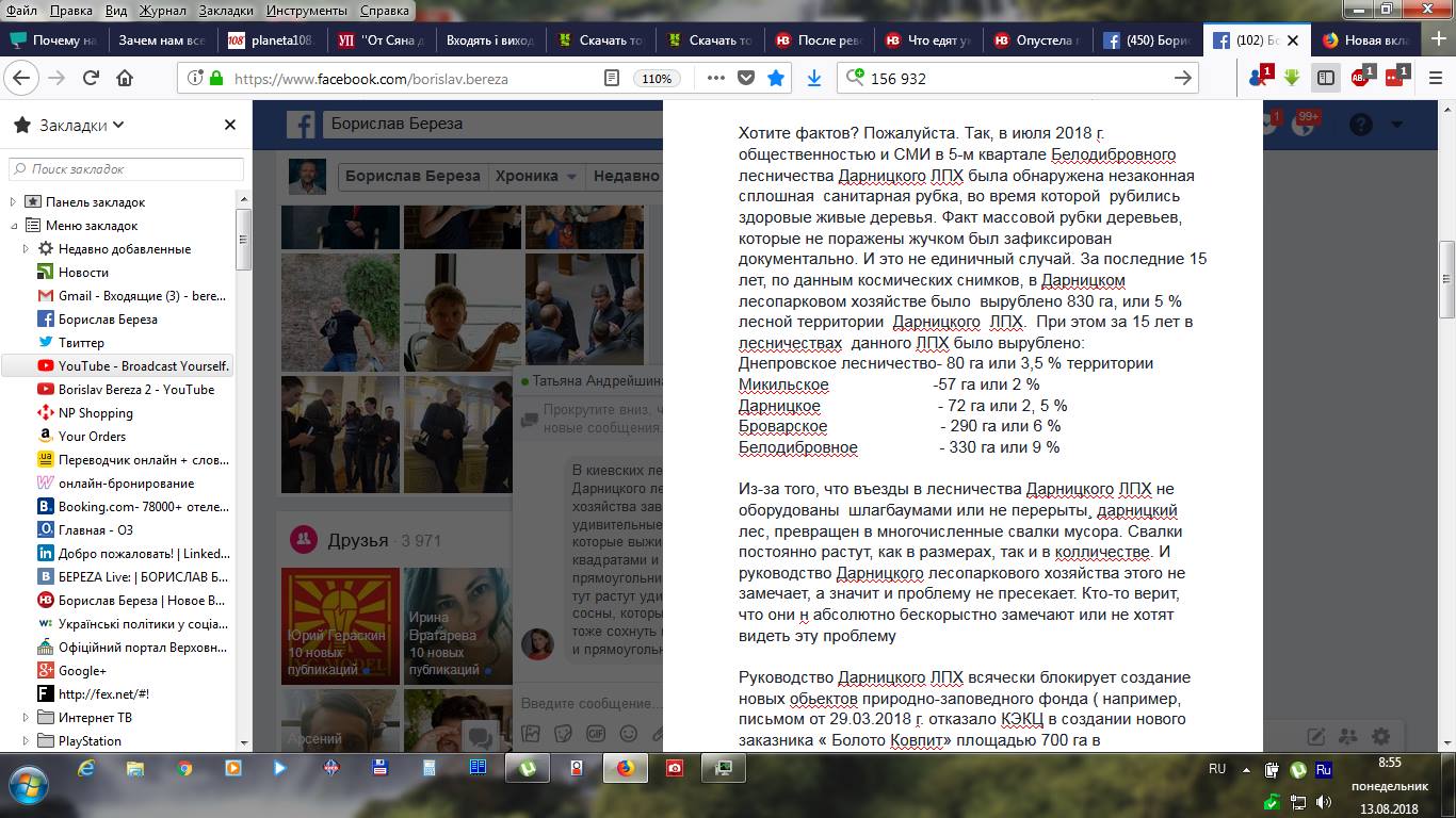 Хотите фактов? Пожалуйста. Так, в июля 2018 г. общественностью и СМИ в 5-м квартале Белодибровного лесничества Дарницкого ЛПХ была обнаружена незаконная сплошная санитарная рубка, во время которой рубились здоровые живые деревья. Факт массовой рубки здоровых деревьев, которые не поражены жучком был зафиксирован документально. И это не единичный случай. За последние 15 лет, по данным космических снимков, в Дарницком лесопарковом хозяйстве было вырублено 830 га, или 5 % лесной территории Дарницкого ЛПХ. При этом за 15 лет в лесничествах данного ЛПХ было вырублено: