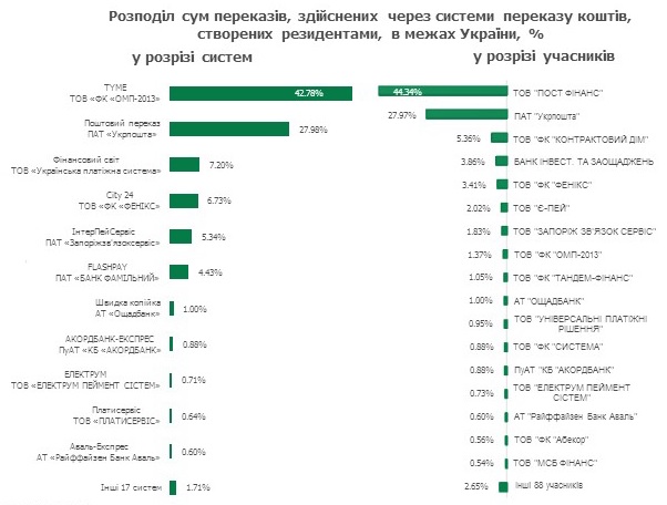 В разрезе платежных систем лидером стала оскандалившаяся TYME, принадлежащая ФК «ОМП-2013», на которую пришлось 42,78% рынка: 22 июня Нацбанк отменил ее регистрацию по настоянию СБУ, обвинившей переводчиков в отправке денег в РФ (в санкционной деятельности). Впрочем, утверждать, что все 42,78% перечислений — заслуга лишь ФК «ОМП-2013» тоже нельзя. Поскольку системой TYME пользовалось множество партнеров. Кстати, и «Новая почта» в том числе (несмотря на наличие своей «Пост Финанс»).