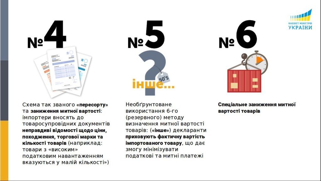 На этом же заседании премьер опубликовал целый набор схем, которые сейчас активно используют на всех таможенных пунктах вдоль границы Украины. Они включают себя как простые махинации из разряда мелкого уклонения от налогов, так и масштабный вывоз из Украины леса-кругляка.