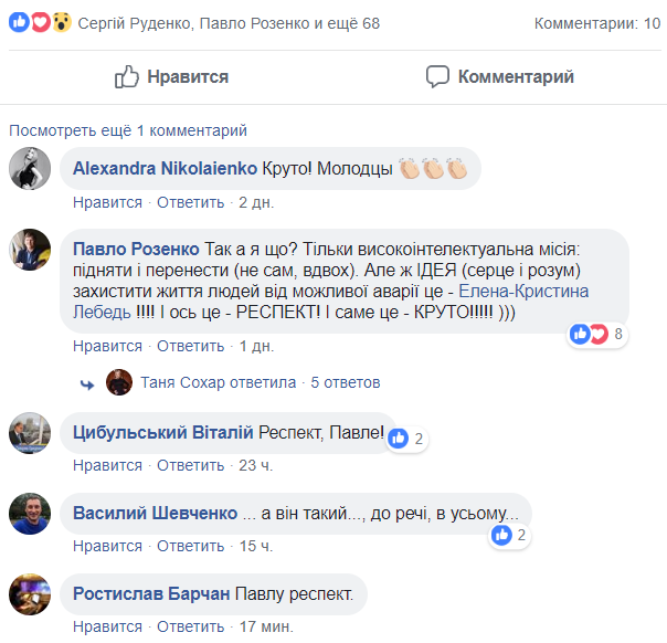 "Остановилась на Подоле на аварийках: плита посреди дороги на крайней левой полосе! Можно объехать! Но любому мотоциклисту – кирдык и авария! Сама поднять не смогла! Знаете, КТО стал на аварийках помочь? Вице-премьер Павел Розенко. Без вопросов! Схватил тяжелую плиту, подбежал еще парень из прохожих! И хлопцы расчистили дорогу! Вот так - без пафоса и понтов. Фоткаться отказались оба. Но я не смогла промолчать. Респект и уважуха! Не перевелись ещё в стране настоящие мужчины! И это круто!" - написала на своей странице в Facebook ведущая Елена-Кристина Лебедь, которая стала свидетельницей происходящего.
