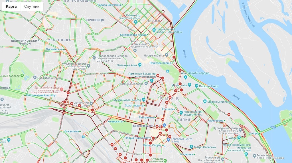 Помимо этого, проезд запрещен в сторону центра от Национального цирка Украины, Почтовой площади, а также поблизости станции метро "Олимпийская" и "Дворец спорта".