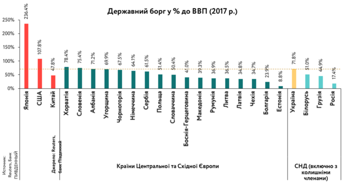 Зазначається, що у таких розвинених країн, як США і Японія, співвідношення держборгу до розміру економіки значно вище, ніж в Україні (108 і 236% відповідно). А у сісідніх Білорусі та Польщі ця цифра становить 50%.