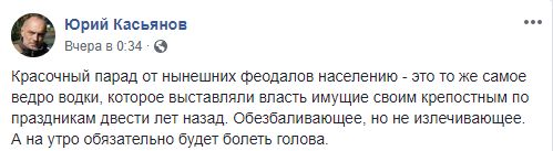 Волонтер Юрий Касьянов пишет: «Красочный парад от нынешних феодалов населению — это то же самое ведро водки, которое выставляли власть имущие своим крепостным по праздникам двести лет назад. Обезболивающее, но не излечивающее. А наутро обязательно будет болеть голова».