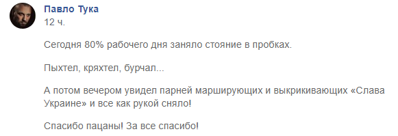 А потом вечером увидел парней марширующих и выкрикивающих «Слава Украине» и все как рукой сняло! Спасибо пацаны! За все спасибо!».